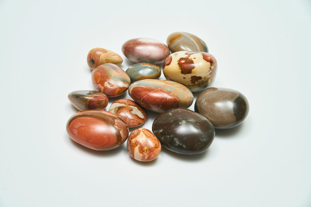 A set of 8 pieces, hand-polished marine stone with extremely strong energy, which can gather wealth. The colors and weights vary. Each piece is approximately 5-6 cm long.